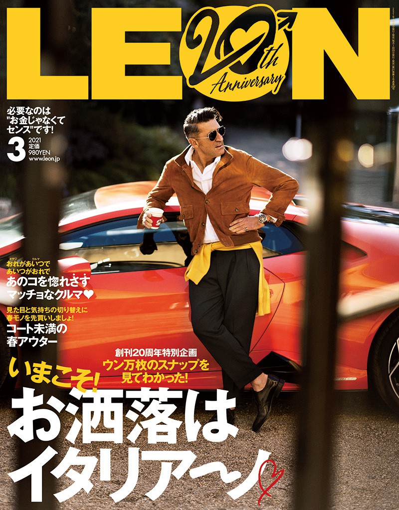 本特集の巻頭を飾ったジローラモのこなしも、実はスエードブルゾンの茶×黒合わせでした。LEON流のポイントはインナーに合わせた白シャツです。さらに腰巻きニットで色気も添えて。