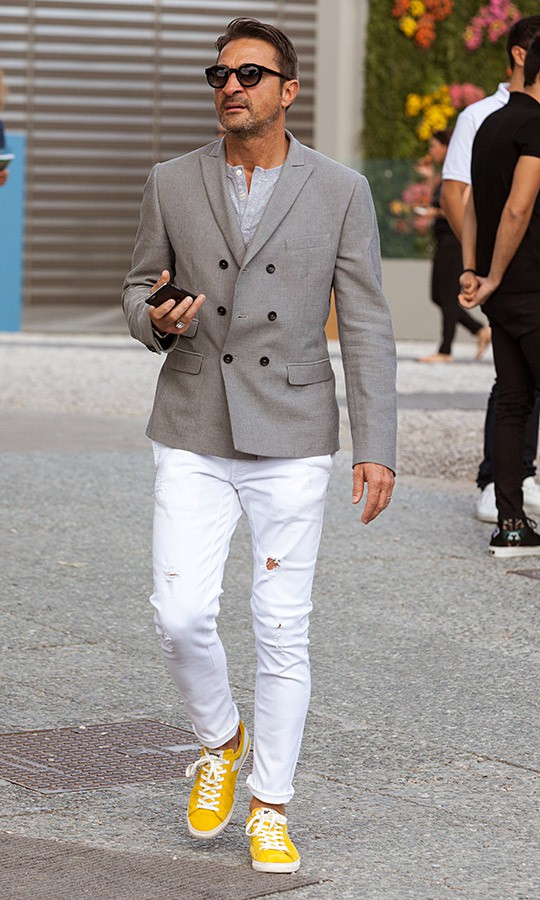 シャカシャカした生地のネイビーのダブルジャケットに、共生地のクロップド丈パンツを合わせた御仁。こういういまどきのセットアップを白Tシャツ&白スニで攻略するのは定石ですが、あえて足元に蛍光グリーンのランニングシューズをチョイスしてしまうのがさすが。じつは足元はこういう強い色味を持ってきてもありなのです。