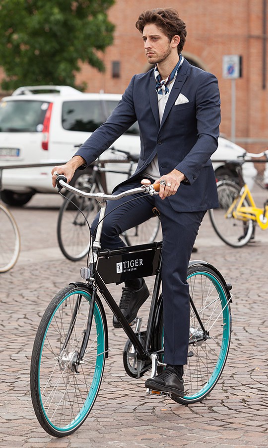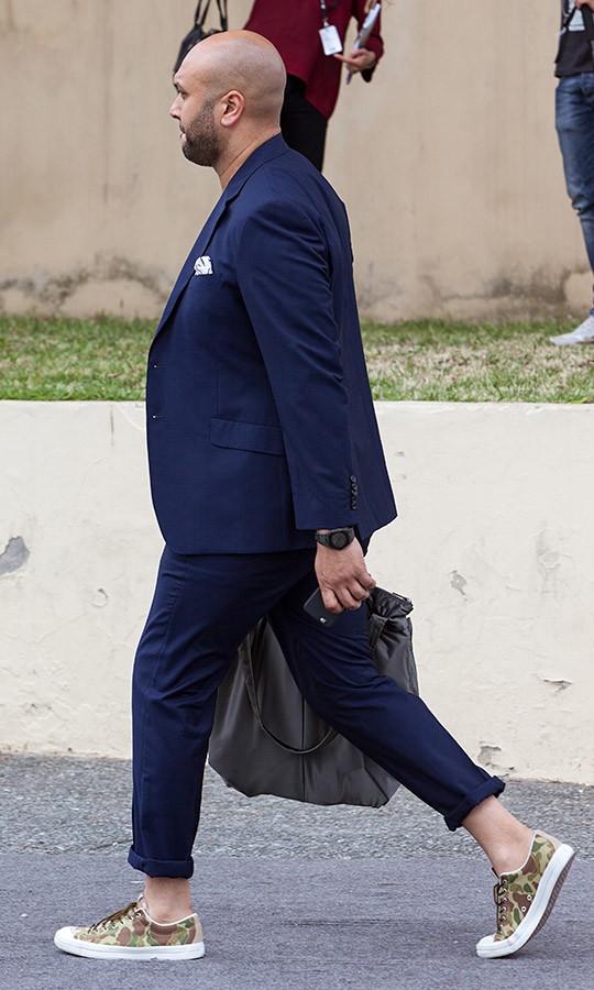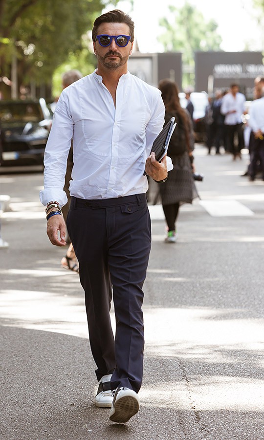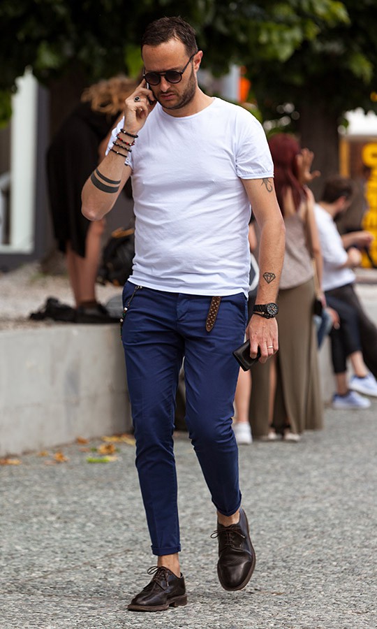 言ってしまえばTシャツにスラックスというド直球な軽装。しかし紺と白のハーフ&ハーフな装いのため、非常に洒脱な印象に仕上がっています。もちろんトップス、ボトムス共にサイズはばっちり。特にTシャツのラフな袖捲りが装いのエッジになっています。また、ダブルブリッジの大きめサングラスが髪形とマッチしており、それだけで印象に残る雰囲気に。やっぱりヘアスタイルを含め顔回りの作り込みって大事なんですね。