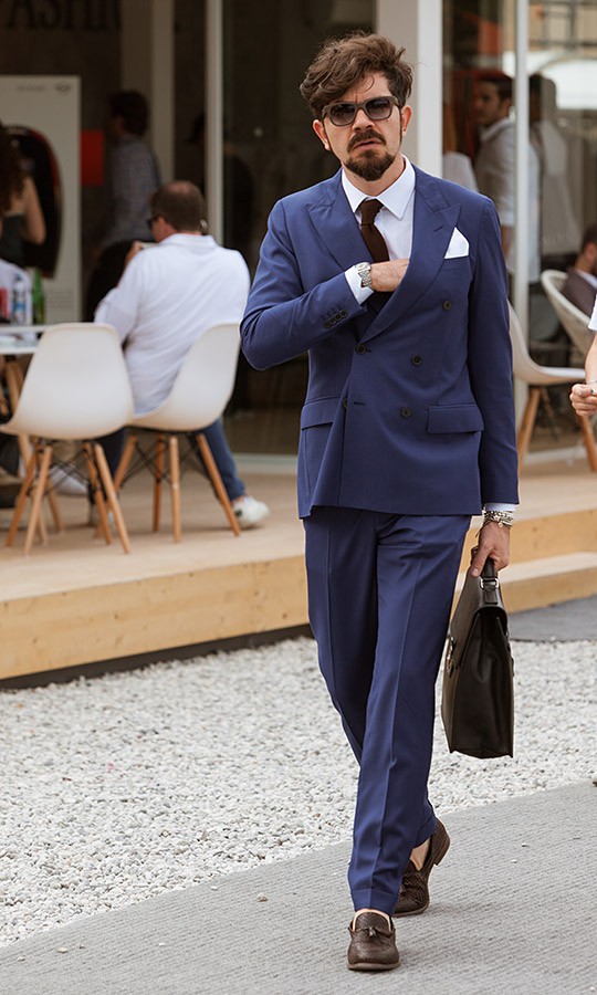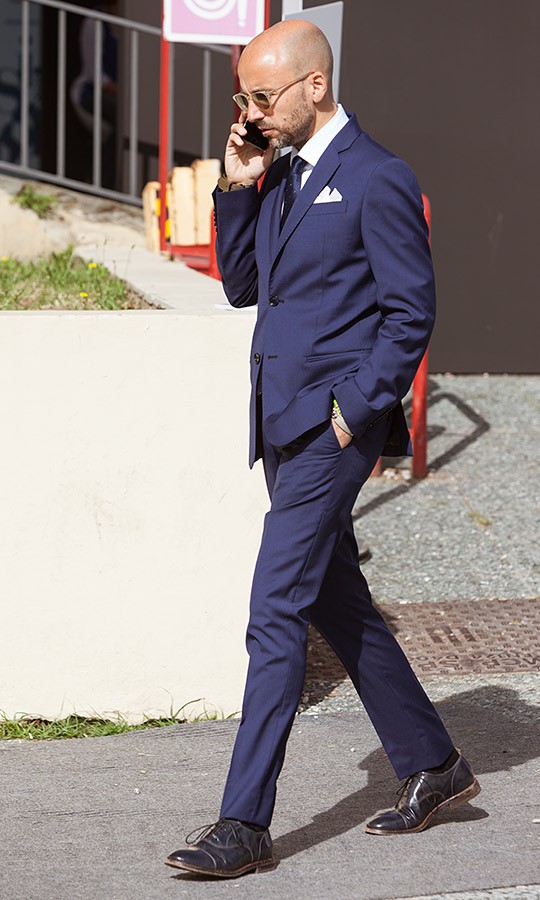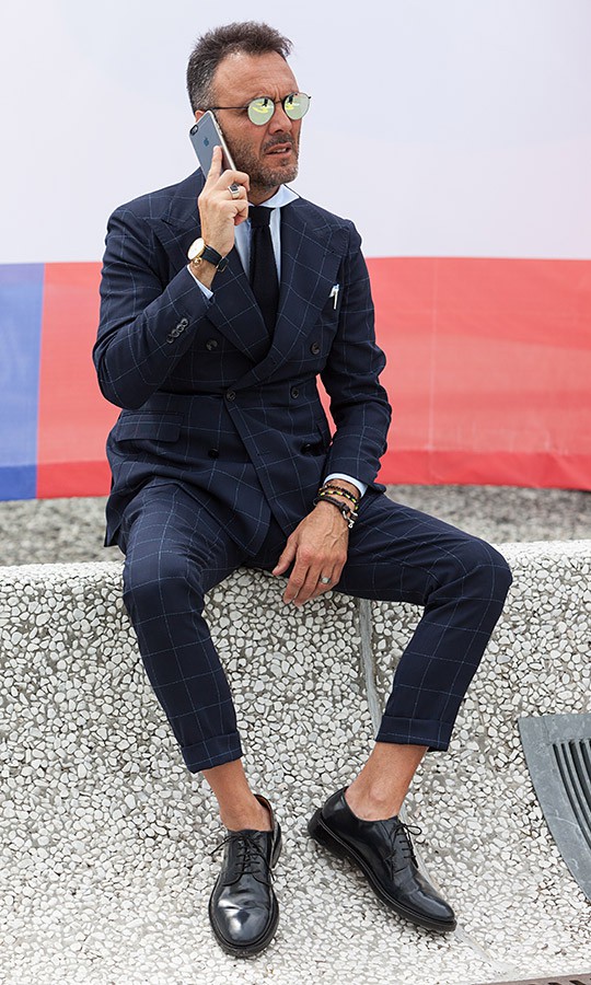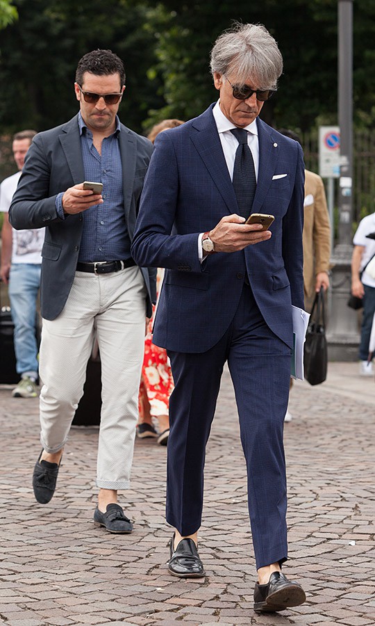 ネイビーのダブルスーツはコットンでしょうか、シックななかにも夏らしい寛ぎを感じさせる磯島さん。ラウンドカラーのシャツにシルクのニットタイというチョイスも実に小粋ですが、ヌキ所は足元。素足に加えエラスティックを用いないスリッポンシューズの合わせが非常に個性的かつ軽妙。全体的にサイズもバッチリです。