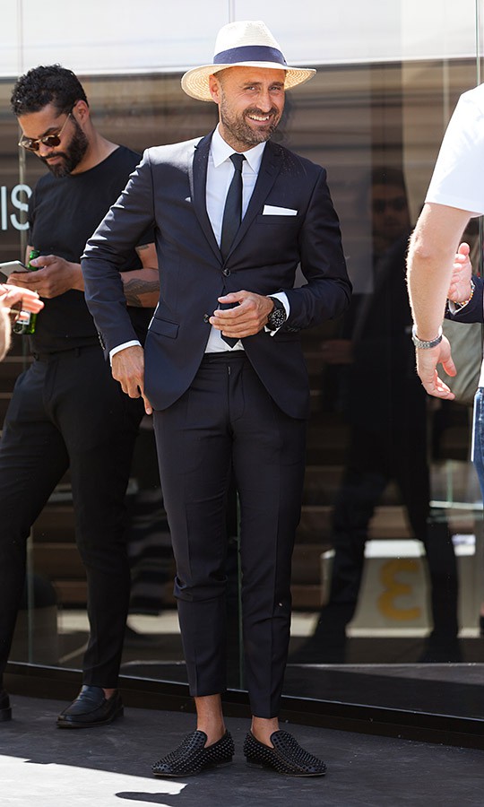 シャツをホワイトにして、クリーンなハーフ&ハーフスタイルがキマる鈴木慎也さん(41歳)。カッタウェイカラーのドレスシャツなので、襟羽で首元がバタつくこともなくスッキリした印象です。何より秀逸なのはハットとパンツのカラーを揃えていること。これにより完成度の高いハーフ&ハーフスタイルが完成しています。小物もパネライとロエベでしっかり“大人の重み”を添えているのが秀逸。