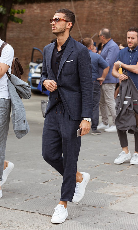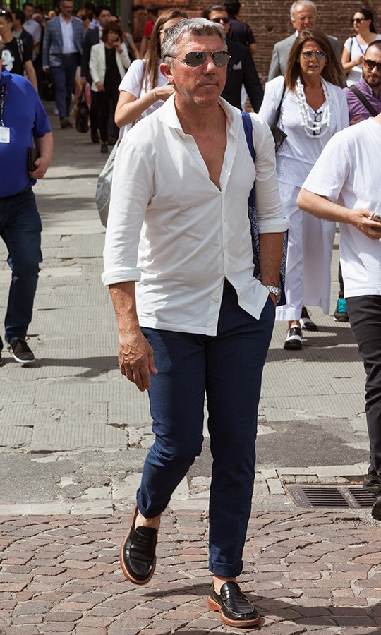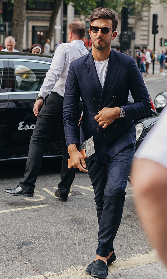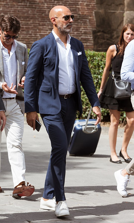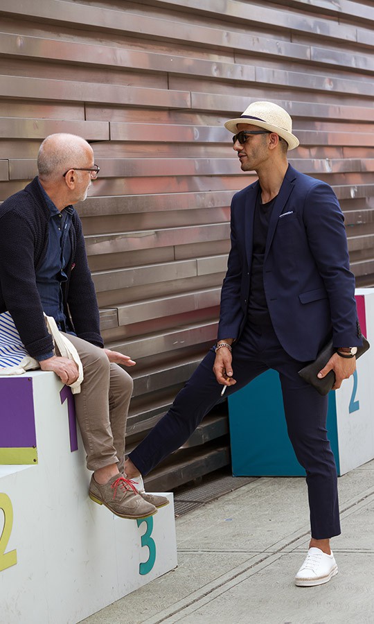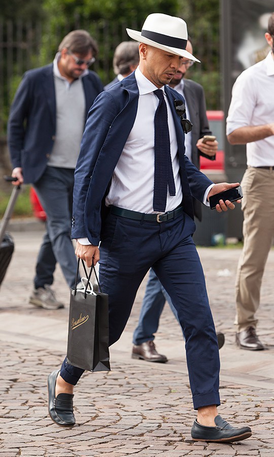 なかでも参考にしたい「紺×白」、それに「オール紺」の着こなしを、街の達人スナップから学んでいきましょう。