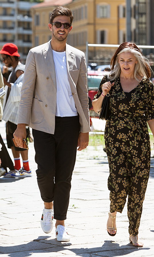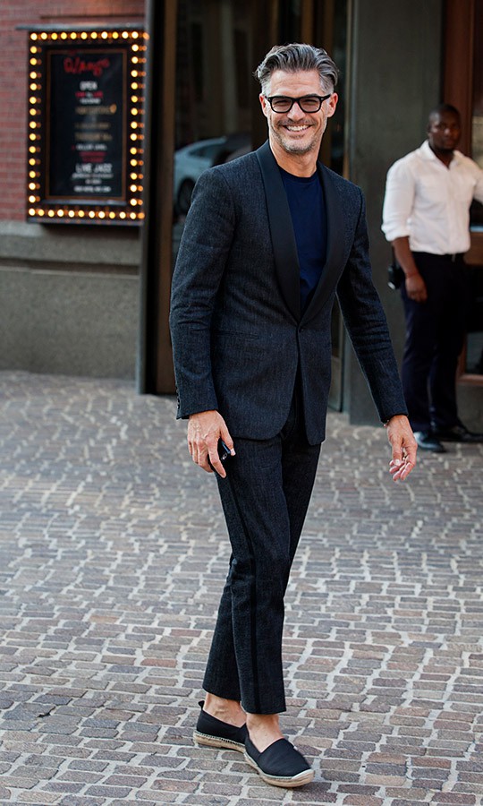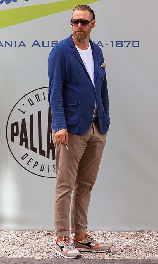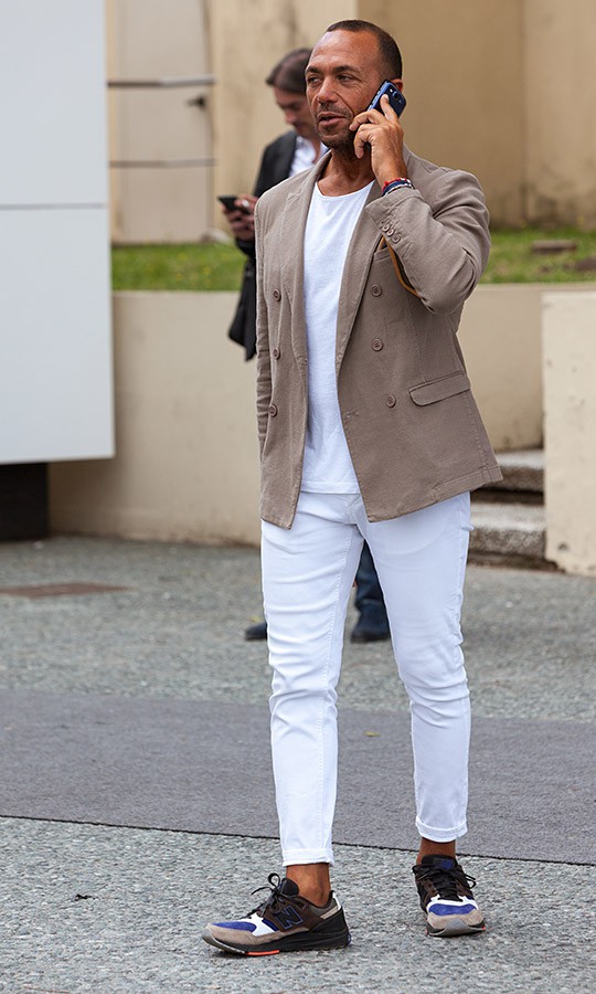 片山貴之さん(43歳)は、ジャージージャケットにネイビーのクルーネックT、ボトムズは白パンというシンプルかつオトナのリアルなスタイルで。Tシャツは細リブですが、濃色ゆえに下着っぽく見えないのです。足元はランバンのスエードシューズですが、ネイビーを合わせているあたりがぐっと洒落て見えます。