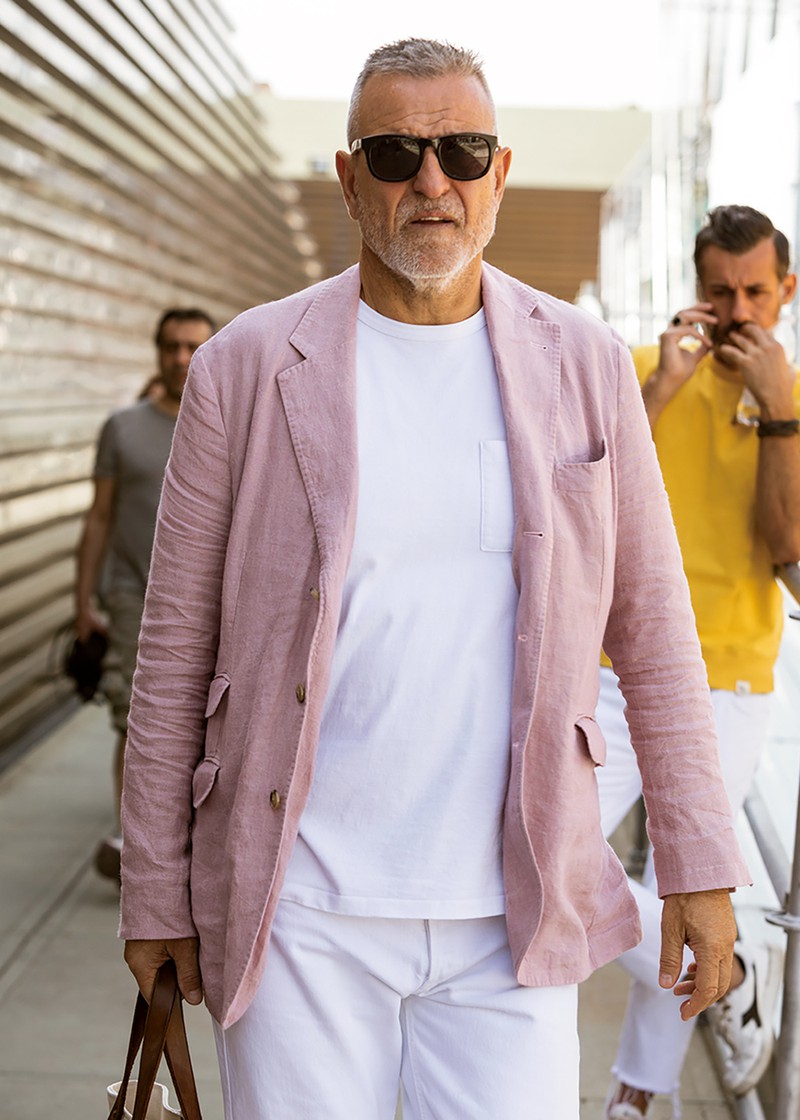 白Tと白パンの上に羽織ったピンクのジャケットが可愛げたっぷりでかつ上品さも。オヤジさんにこそこんな色のジャケットが渋さと相まっていいのです。