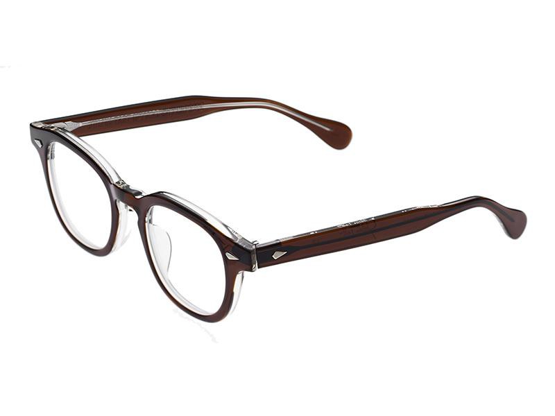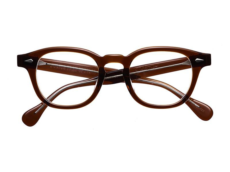 「アーネル」は、ジョニー・デップが使ったことで一世を風靡した傑作ボストン。その持ち味であるアクの強さを少しばかり抑えたいなら、表面が茶色、背面はクリアなバイカラーをお試しいただきたく。重々しさを感じさせずに、あの表情が拝借できますよ。3万7000円/ジュリアス タート オプティカル(ボンド アイウェア)