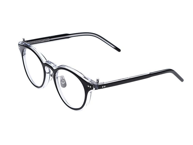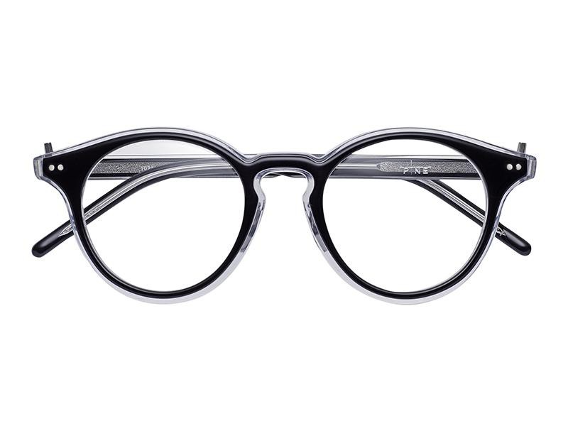ジュリアーノ フジワラのクリエイティブディレクターとして有名な松村正大氏が作る、クリア生地の表面にひと回り細く黒いボストンをペイントした華奢な見映えの変わり種。智元から上にせり出した六角柱も相まって、個性的な目元を演出します。3万2000円/パイン(フォレストパイン・デザインラボ)