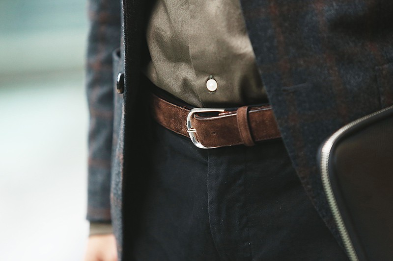 さらに、ベルトと靴を同色のブラウンに。そのあたりも抜かりありません。あえてノーソックスでダークトーンの着こなしに軽快さをプラスしているテクニックもさすがです。