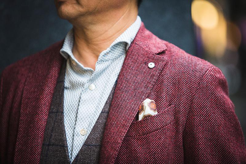 鮮やかなジャケットはL.B.M.1911。インに着たジレはタリアトーレ、シャツはルイジ ボレッリ、チーフはビームス。