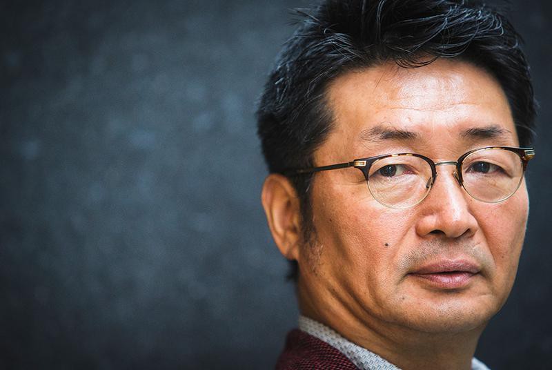 ブラウンのスーツはサルトでオーダーしたもの。ネクタイはアッドバン ノッチ、メガネはオリバーピープルズ。
