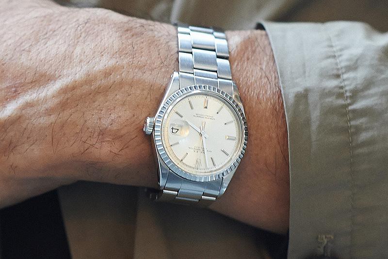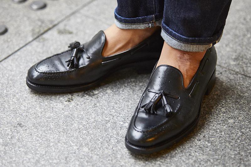 七三に分けたツーブロックのヘアスタイルも全身がスッキリ見えるポイント。時計はタグホイヤーでオトコっぽさを演出。足元はタッセルローファーでほどよく上品に。