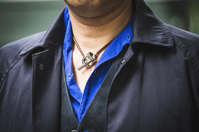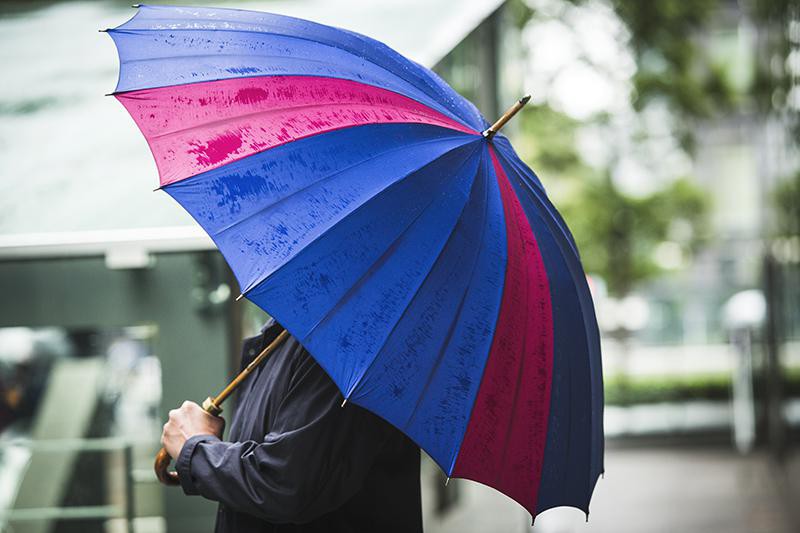 エルメスのチョーカーにカルティエのリングを通す、この高等なテクニック!それがまったくイヤミにならないところもさすがです。ブルーグラデーションのコーディネイトだからこそ、ベージュのバッグがワンポイントとして映えるわけです。前原光榮商店の傘もこの通り、ブルー! 傘にこだわるとそれだけで大人の風情が薫るという好例。 開くとこの通り、別注で部分的に赤系の刺し色が入っています。