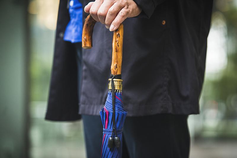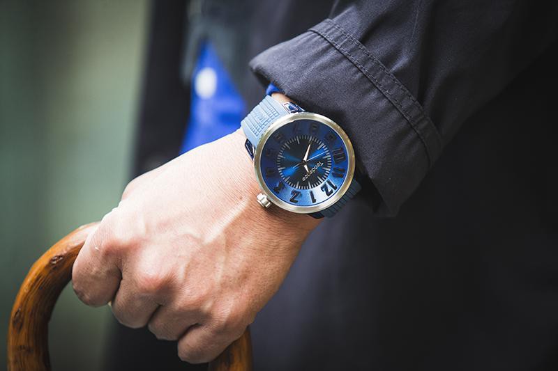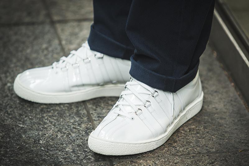 ネイビーのコートにブルーのシャツ、ネイビーのベストと全身ブルーのグラデーションが目を引く梶井久也さん。さらに傘も時計もブルーというこだわりぶりに取材陣も感心しきり。ブルー系ばかりだと、くどくなりそうなところをエナメル素材のレオン別注K-SWISSで、上手に息抜きがなされている点が素敵です。白はブルーとも相性が良いうえ、軽やかにも見えるので、この装いにはベストチョイス。しかも、エナメルなので雨を弾いてくれるわけで、実用性もばっちり。