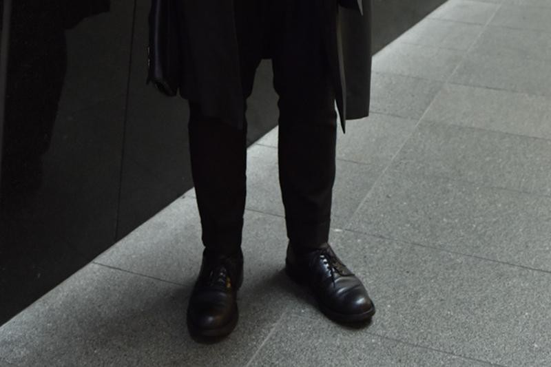 佐藤さんはコートのフロントを止めずに着用。コートをなびかせて歩く姿は、まさに軽やかなジェントルマンです。さらにボリューム感のあるシューズやハットを加え、カジュアルな中にも伝統的な紳士の風情が薫るのも秀逸です。