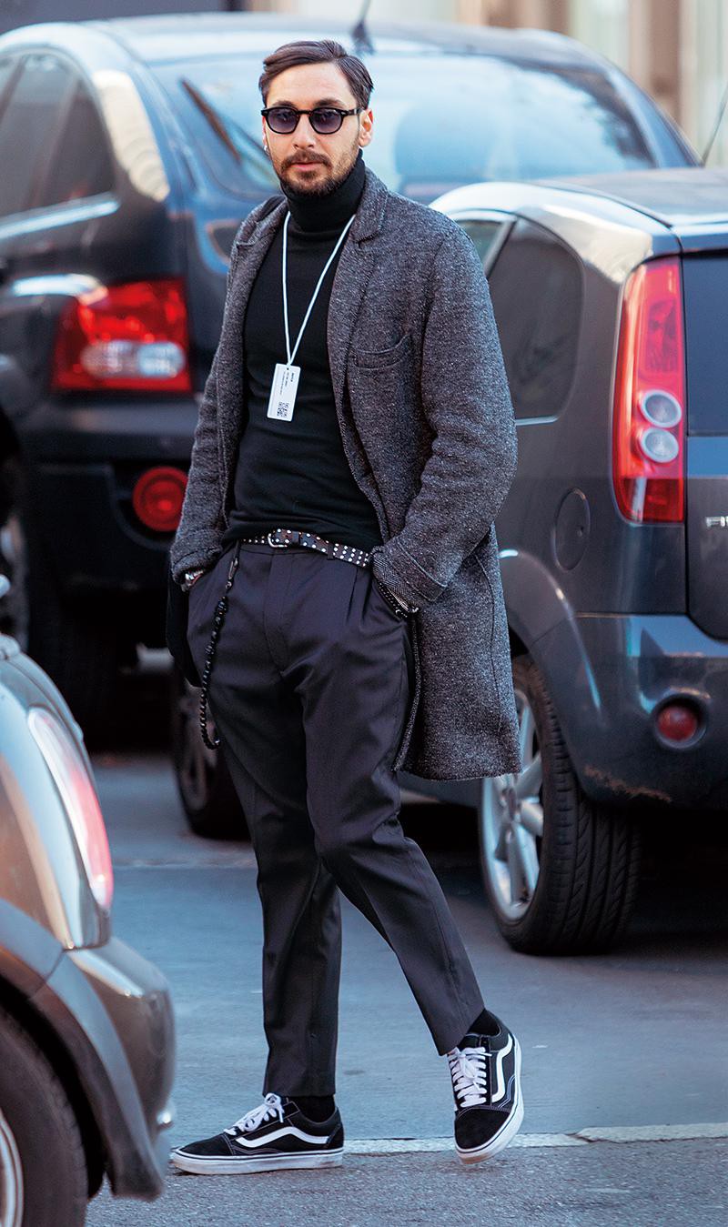 チェスターコートのキッチリした印象と、ストリート感がミックスされた着こなし。スタッズベルト、スケーターシューズをさり気に取り入れ、やんちゃなスタイルに。