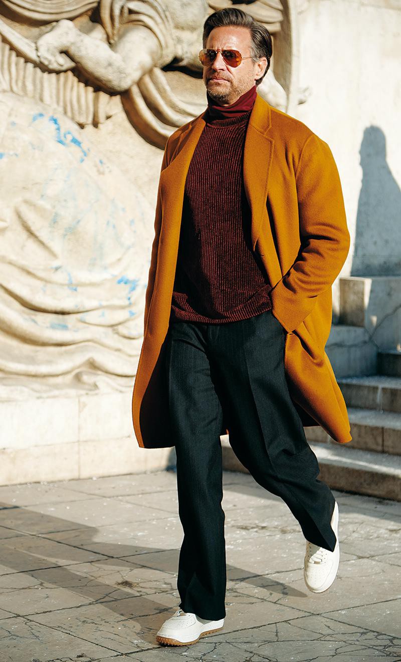 深みのあるレッドのニットにユルリなシルエットの黒スラを合わせる御仁。そこにサラリと羽織るのはオレンジのチェスター。色使いが上手いのはもちろん、リッチ感あるドレープから上品かつエレガントなムードがムンムンです。