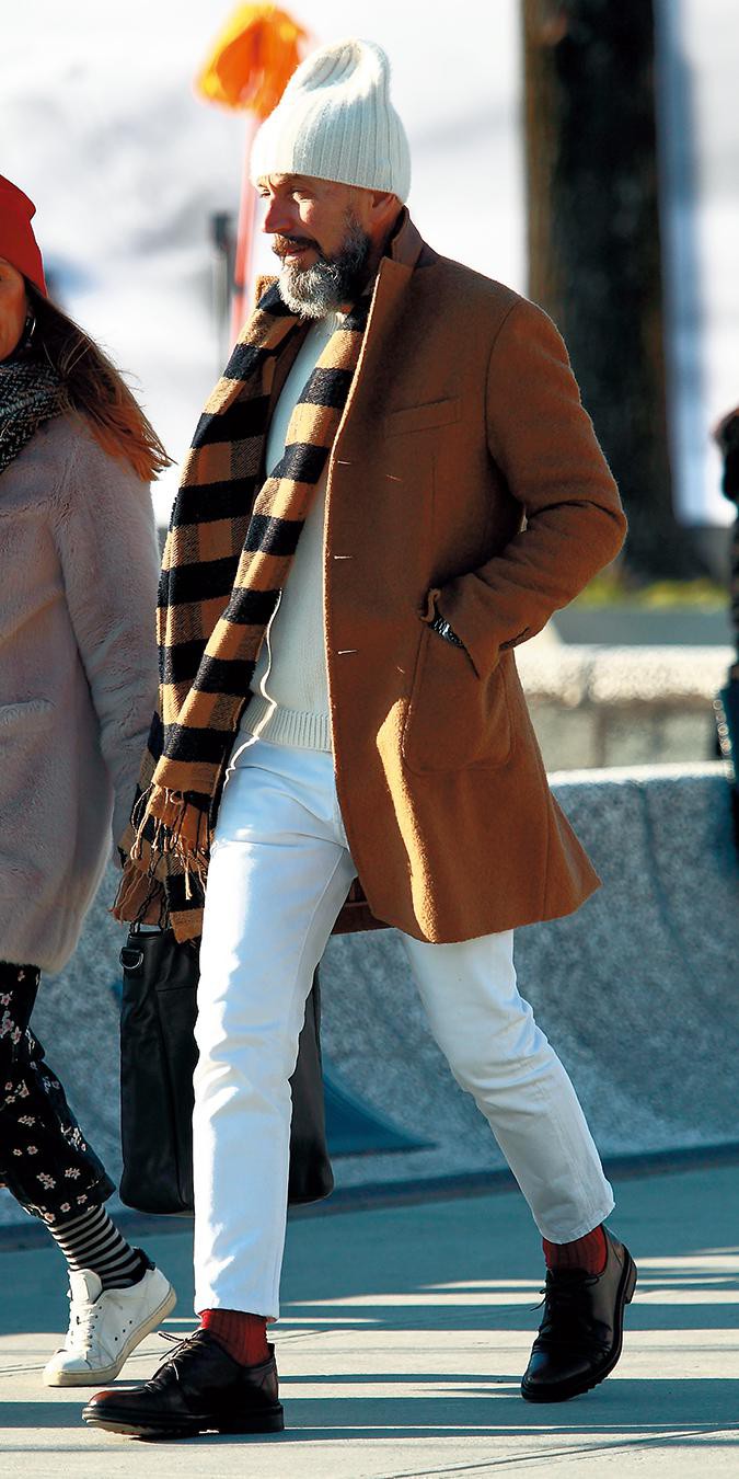 ニットキャップから、中に着たニット、パンツまで白で統一し、ジャケットではなく、ロングジャケットのように、チェスターコートをばさり。まさにジャケット感覚な着こなしです。