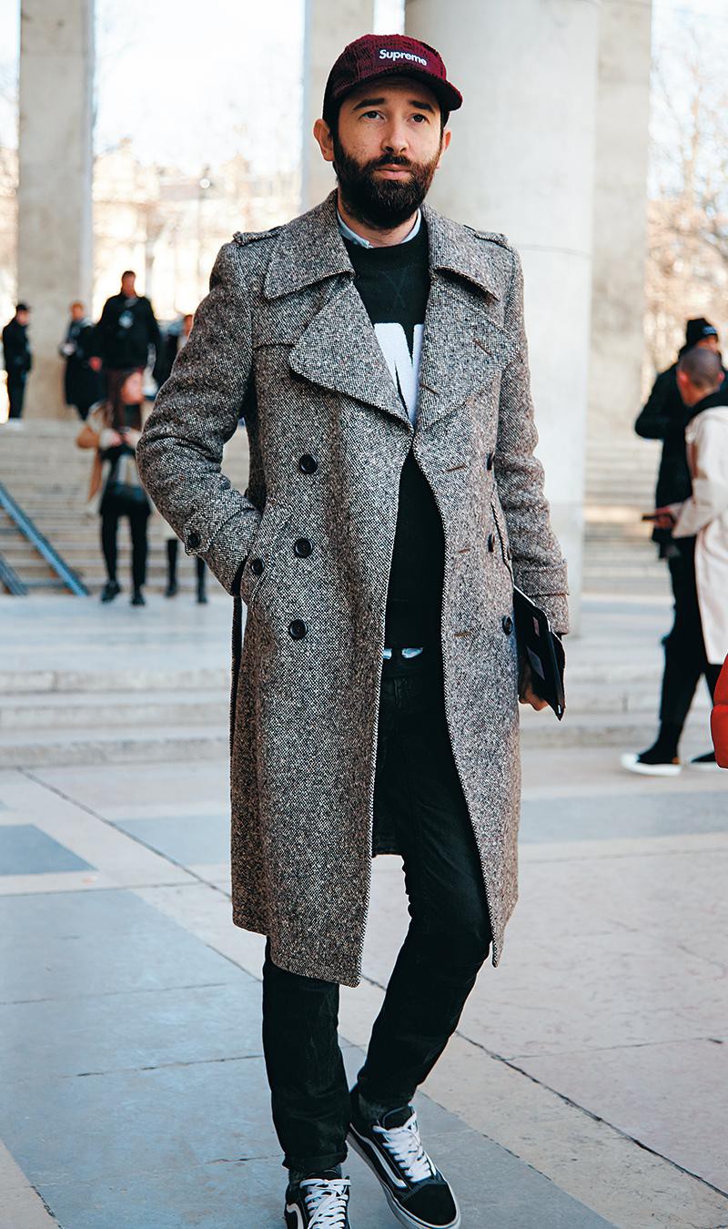 よりスポーティにトレンチコートを着たオヤジさん。グラフィックがチラ見えするニット、ストリート感抜群のキャップとスニーカーで、やんちゃなムードが漂いますね。