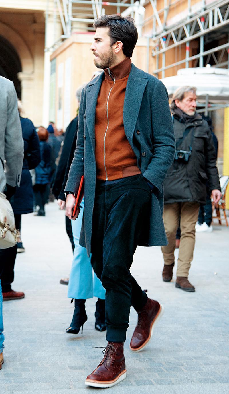 全身濃いめの色でコーディネートしていますが、ヌケ感を醸し出しているのは、インナーに着た鮮やかなブラウンのブルゾンによるもの。