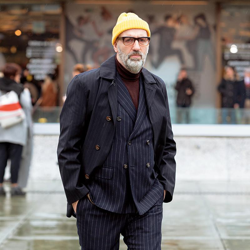 合わせ幅の狭いダブルのスーツをコンパクトなサイジングで着こなすオヤジさん。ポイントはなんといってもイエローのニットキャップ。若々しさが倍増しています。
