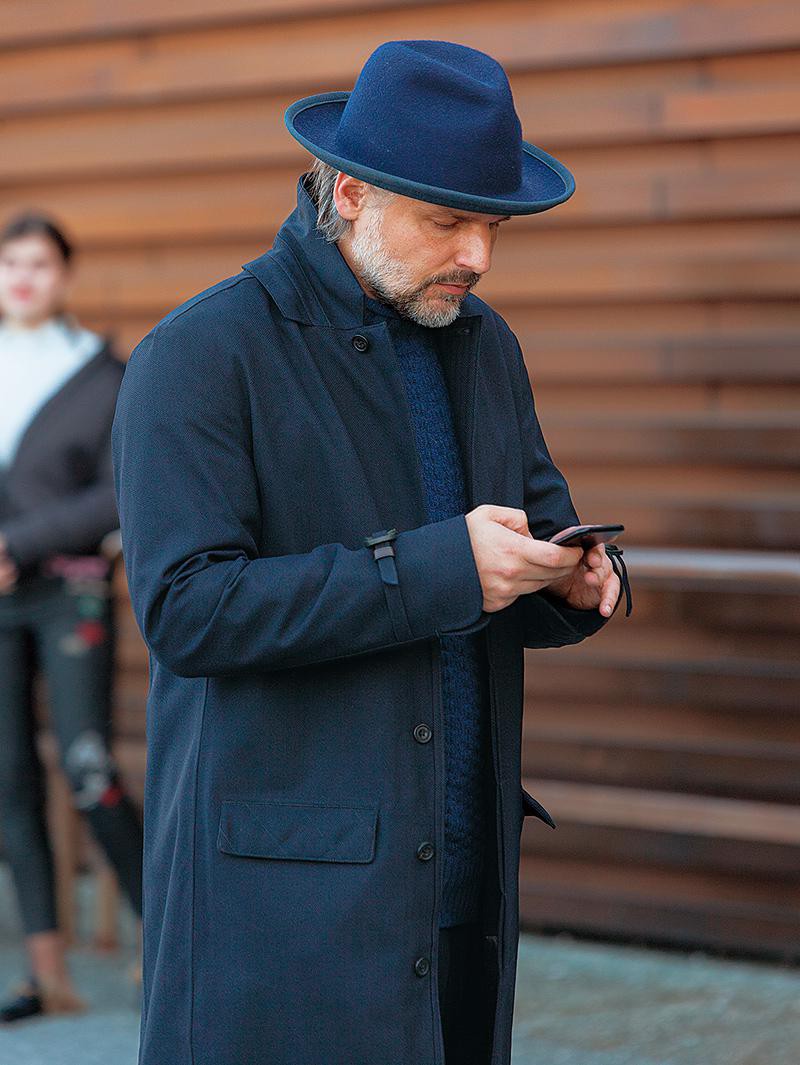 ネイビーのワントーンの中に取り入れた鮮やかなブルーのハットが、オヤジのシブさと洒脱さを演出しています。