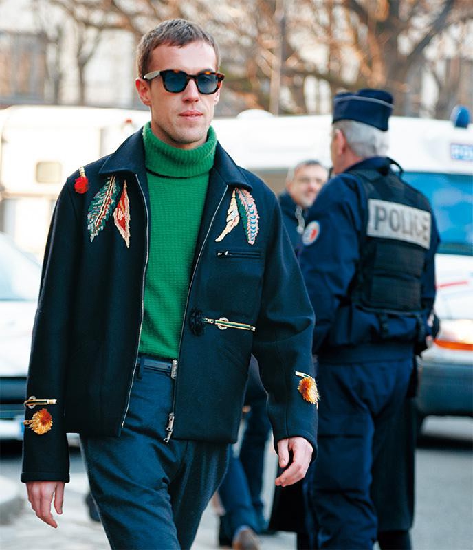 両肩に刺繍が入ったブルゾンに、さらに華やぎさを足しているのがグリーンのがタートルネックニット。グリーンのもつみずみずしさが、オヤジさんを若々しく見せてくれます。