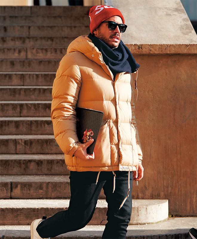 ベージュのダウンに細身の黒パンを合わせたベーシックなスタイル。赤いニットキャップがいまどき感を加味しています。