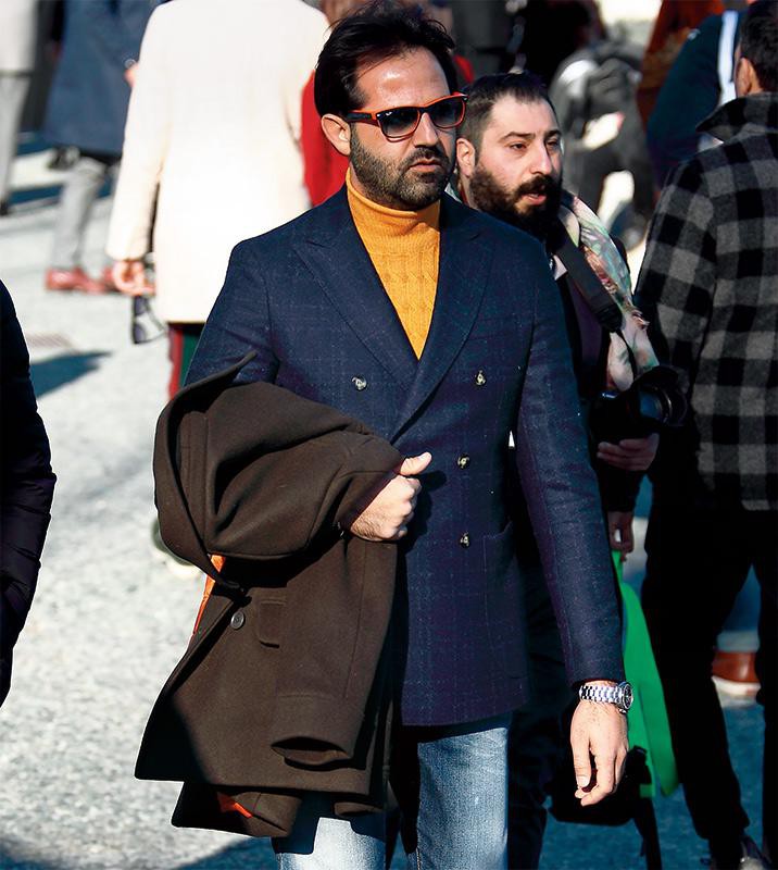 ダブルのネイビージャケットを軽快にこなしたお手本がこちら。ダブルの紺ジャケットに色落ちしたデニムもこなれていますが、マスタードイエローのタートルネックが効いています。