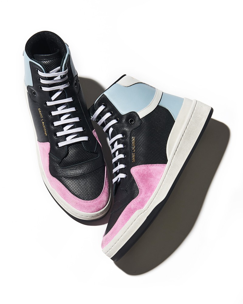 パンチングレザーのブラック、スムーズレザーのサックスブルー、スエードのピンクと、マルチカラーを異素材の組み合わせで表現。ポップな配色とやりすぎないボリューム感が、大人の着こなしに新味をもたらしてくれます。どこか懐かしいローテクモデルを想起させながらも、ラストはスッキリしていますから、シャープなパンツにも難なく合わせられるかと。ハイカットの入門編としてもぜひ。