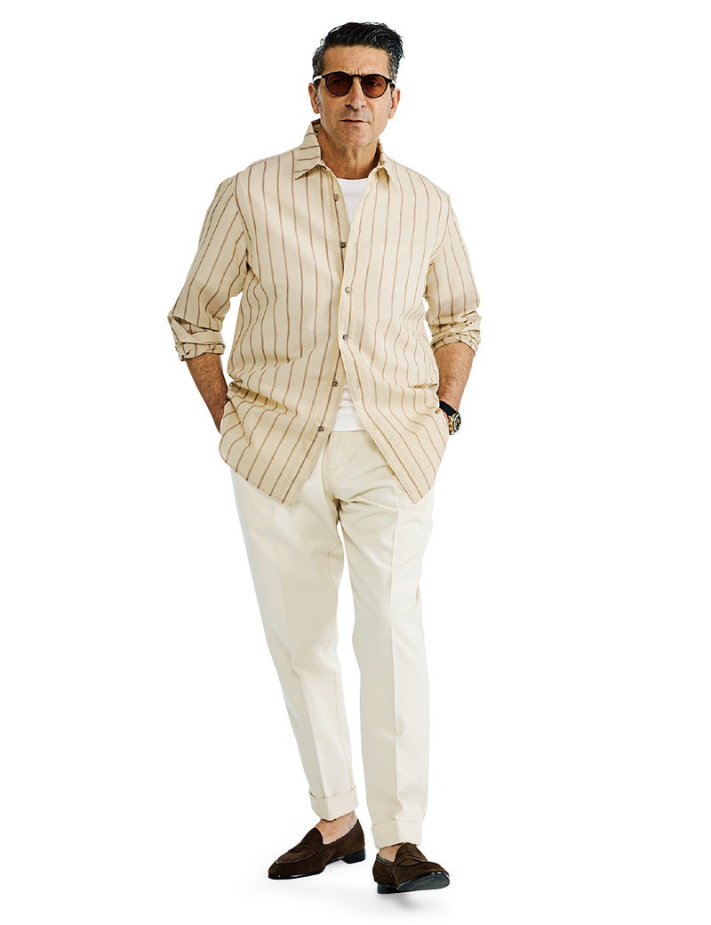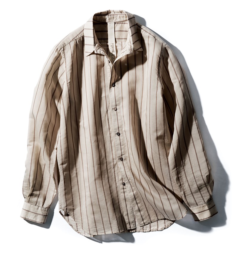 肩肘張らないムードで着こなしたい縦縞のシャツだけに、襟周りが柔らかな作りであることも必須条件。なんなら襟なしも大いにアリですよ。