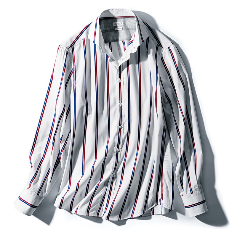 想像してみてください。均整がとれているからこそ相対する人の注意も引きやすい縦縞の服から、素肌が露になっている姿を。柄による緊張と肌の露出による緩和によって生まれるコントラストは、まさしく大人の色気そのもの。その効果効能をもっとも享受できるのが、肌の露出調整が簡単にできるシャツなのです。