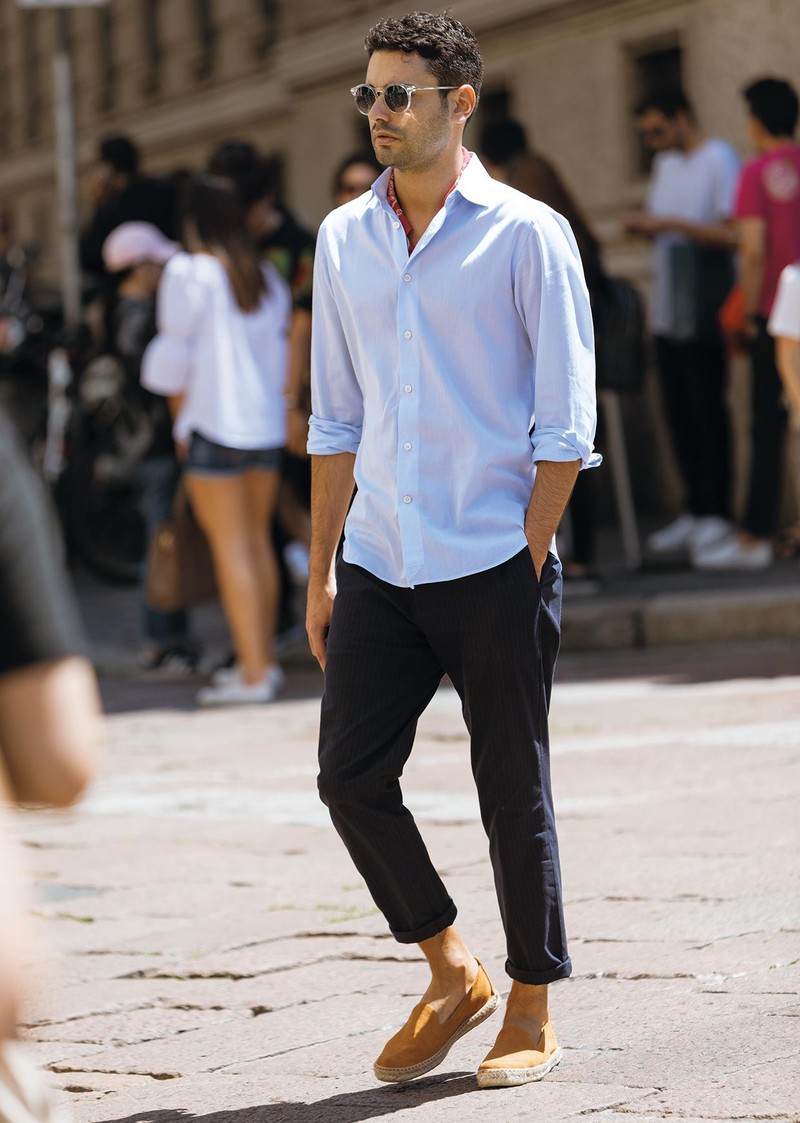 ネッカチーフを巻くとキメすぎに見えるかな......とお思いのオヤジさんは、このようにただ挿してくださいませ。シャツ襟の下にチラリと見えるだけでいい塩梅ですよ。