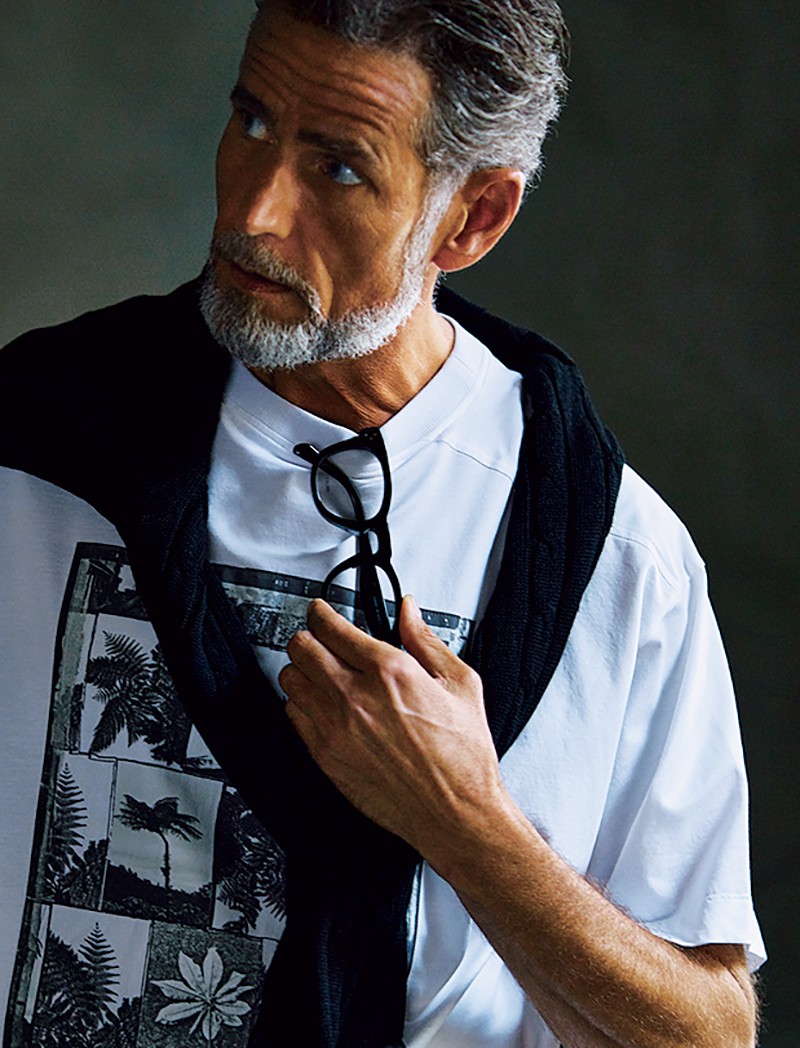 みなさん、ちょっと考えてみてください。“メガネの男”と聞いて思い浮かぶキャラクターって『スーパーマン』のクラーク・ケントや『キングスマン』のハリー・ハートのような太セルの男ですよね。そう考えると極太セルって、やっぱりとてもアイコニックなのですよ。メガネ5万3900円/セリーヌ バイ エディ・スリマン(ヴィジョナイズ カスタマーサービス)、Tシャツ2万5300円/キャバン(キャバン 代官山)、ニット2万6400円/モルガーノ(ビームス 六本木ヒルズ)、パンツ4万2900円/ピーティー トリノ(PT JAPAN)、ブレスレット123万8600円/ホーセンブース(ホーセンブース ギンザシックス店)