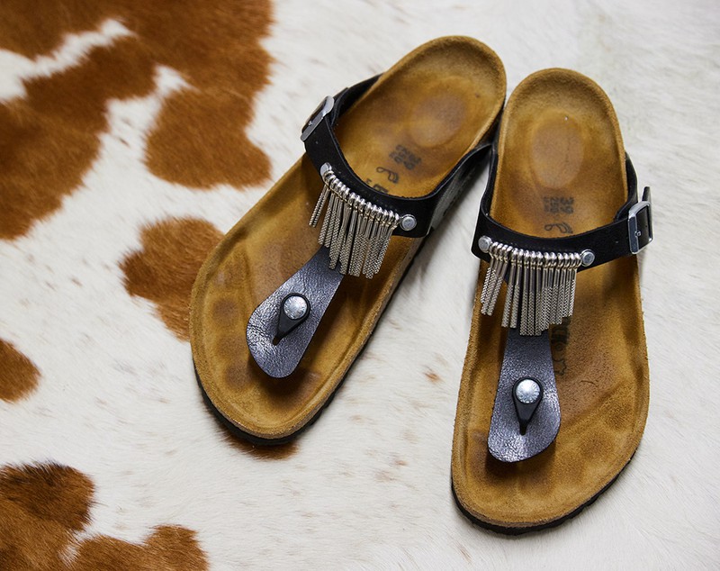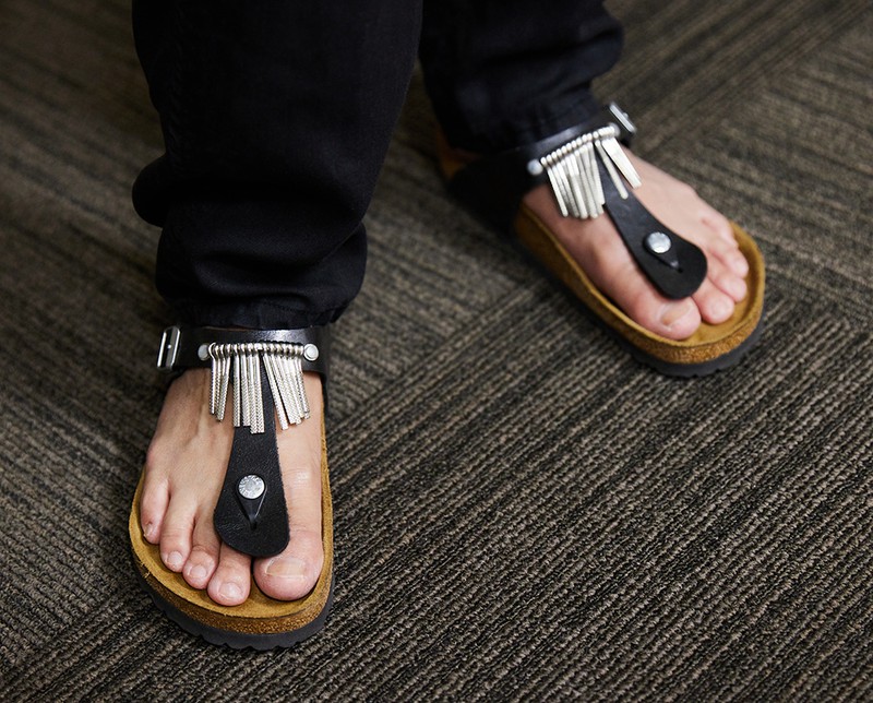 この企画用としてカズさんが選んだ一足は、ビルケンシュトックの「ギゼ フリンジ」。いわゆるトング型の定番的な一足ですが、このモデルはメタルのフリンジがストラップにあしらわれているところに特徴があります。