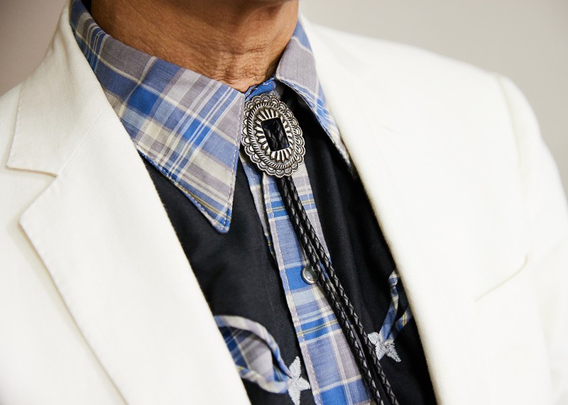 「ラルフローレンの白ジャケットはリネン製。リネン自体は夏以外にも活用したい素材ですが、こと白ジャケとなると、夏が良く似合います。麻素材の持つシャリ感と合わせてパンツもアナトミカのリネンパンツ。その上下だけならばモノトーンスタイルですが、差し色というか差し柄というか、アクセントとしてウエスタンなアイテムを取り入れるのが僕の今の気分。そのウエスタンシャツとテンションを揃えるため、ループタイを取り入れており、同時にまとまり感と個性の演出も意識しました」