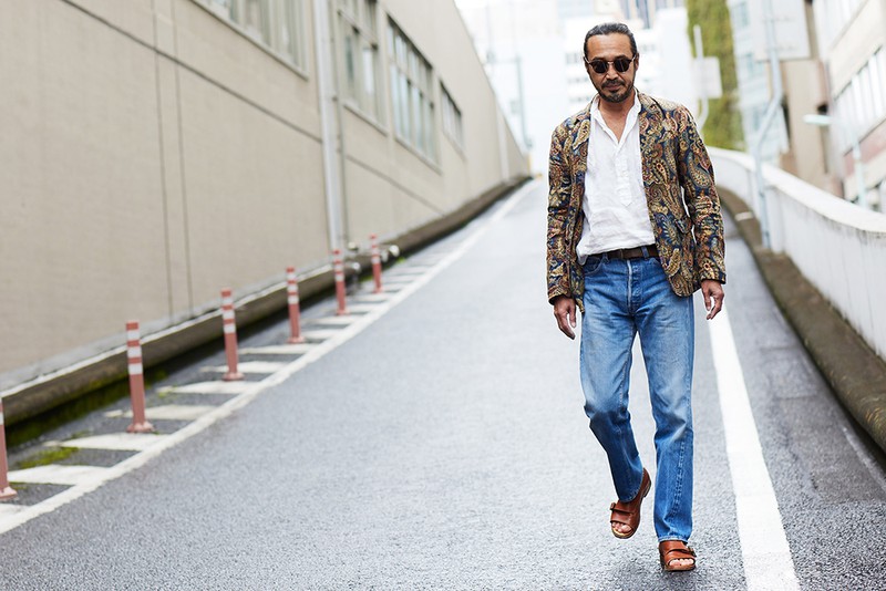 「夏はどうしても薄着が基本ゆえにインパクト不足になりがちです。しかし総柄入りのコットンジャケットなら、軽快でありつつ存在感もばっちり。エンジニア ガーメンツのジャケットはペイズリー柄のテイラードスタイルですが、堅苦しくなくシャツのように羽織れるもの。白無地シャツを中に着込むことで、派手過ぎに見えることもありません」