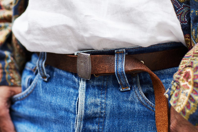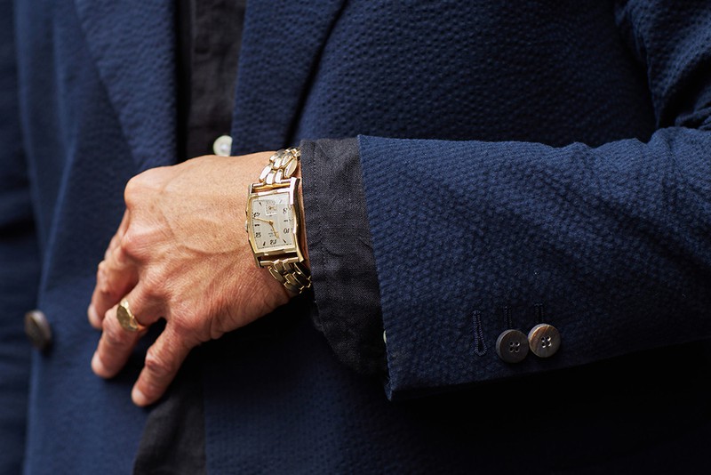 「カジュアルスタイルの時に見せたシルバーバックルではありませんが、ヴィンテージ・アイテムは味わいを添える意味でジャストなアイテムです。この時計は1940年代と思われるエルジンのレクタンギュラー。ゴールドブレスゆえにアクセサリー的な要素を放ちますが、リアルなゴールドブレスレットほど押しつけがましくないところが魅力です」