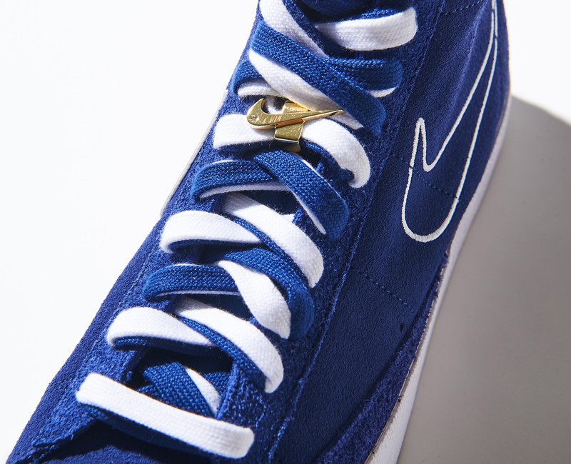 翻ってブルースエードを纏った左の一足は、スウォッシュの50周年を記念したモデル。こちらもアウト側のスウォッシュのみ中抜きの白にしていたり、スウォッシュモチーフの留め具に人工ダイヤモンドをあしらっているなど、目を惹くアレンジがそこかしこに見られます。