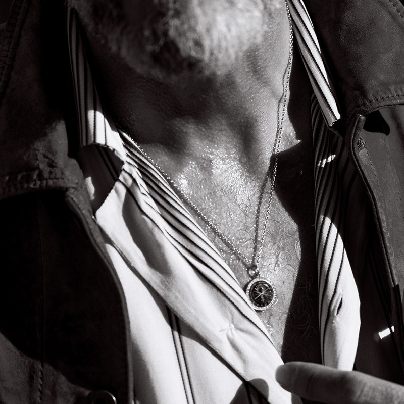 シャツから覗く日焼け肌の艶とドライなスエードの表情が合わさると、男の色気が漂います。ネックレスで視線を誘導するのもお忘れなく。