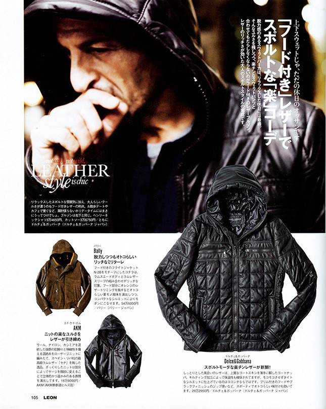 まさかなレザーは、言わばレザーの変化球。ですが、なかには我々オヤジにとってなじみ深いアイテムもあります。そう、レザーパーカです。LEONではコレをリッチと色気とスポーティを全取りできる一着として、10年以上前からず~っとプッシュしてきました(写真は2010年10月号)。