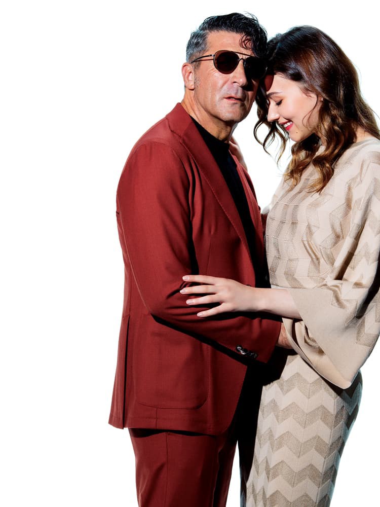 ▲ 男性●スーツ13万2000円/タリアトーレ(トレメッツォ)、ニット2万900円/デザインワークス(デザインワークス 銀座)、サングラス9万9825円/マツダ(オブジェ・イースト) 女性●ドレス17万6000円/ミッソーニ(三喜商事)