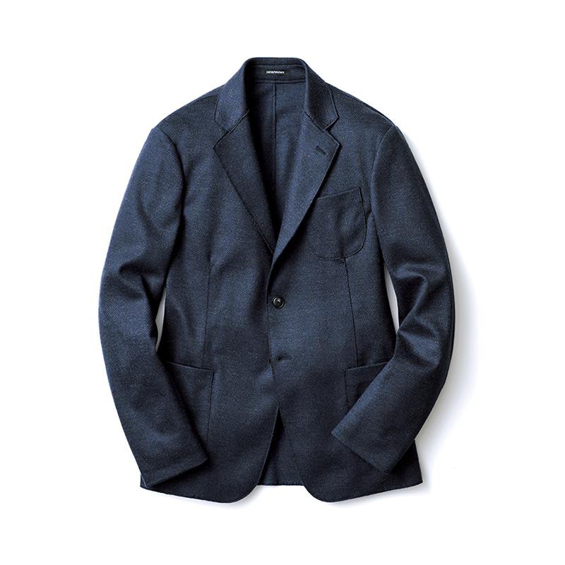 ぱっと見はヘリンボーン織りにも見えるジャカード柄をデザインしたヴァージンウール100%のジャージー素材を使用。かっちりとした印象ですが、作りもアンコンの一枚仕立て。見た目を裏切る軽やか〜な着心地が自慢です。11万5000円/エンポリオ アルマーニ(ジョルジオ アルマーニ ジャパン)