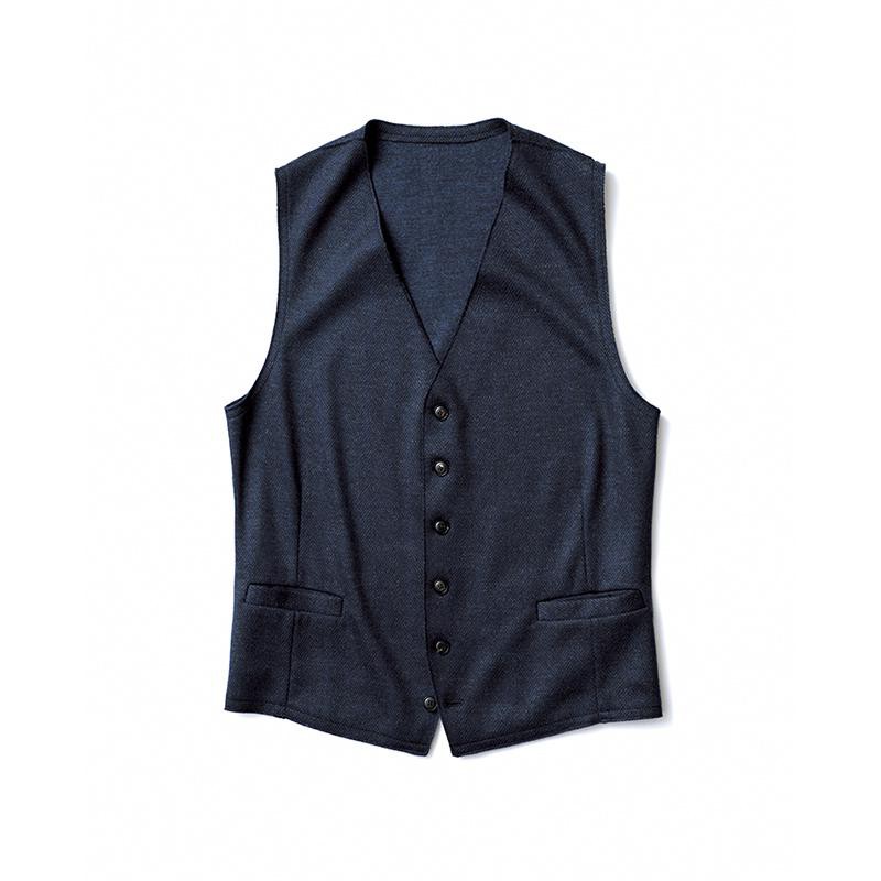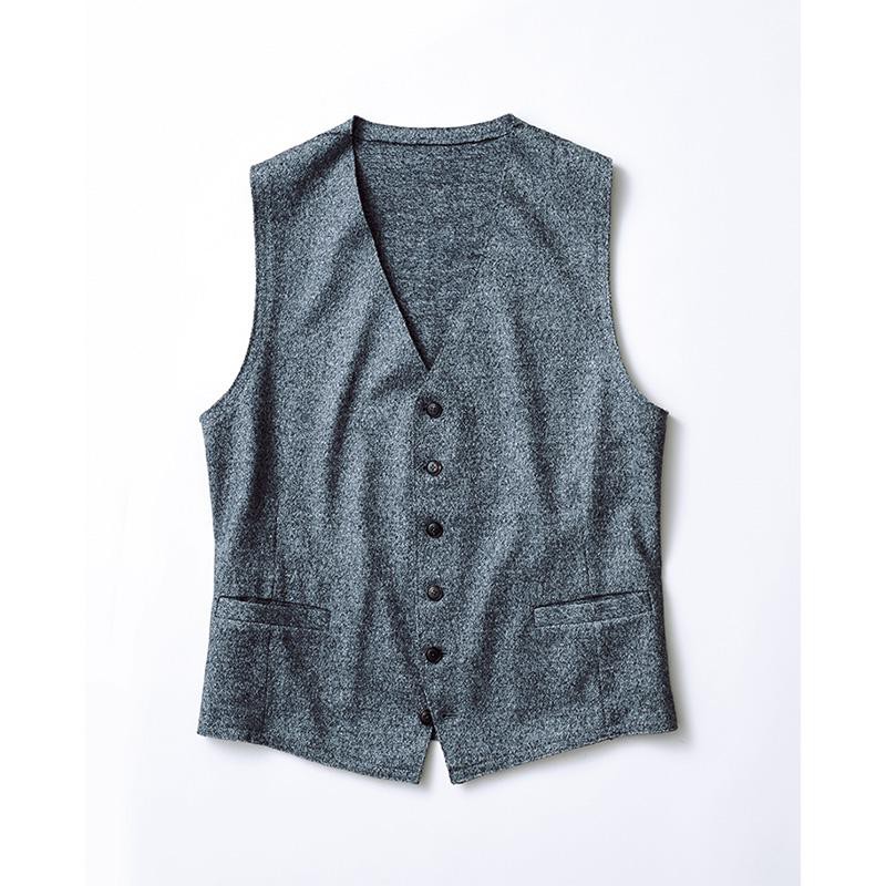 スタンドカラージャケットと共地のヴァージンウール製杢ジャージー素材を用いた6ボタンの襟なしジレ。シンプルなデザインながらも遊び心ある素材感が、ラグジュアリーで奥行きのあるレイヤードスタイルを実現します。4万9000円/エンポリオ アルマーニ(ジョルジオ アルマーニ ジャパン)