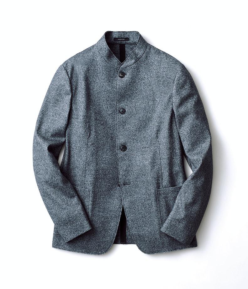エンポリオ アルマーニが得意とするスタンドカラーのジャケットを、軽く、柔らかく、表情豊かなメランジェ調ジャージー素材で仕上げた一着。エレガントさと遊び心を兼ね備えた、同ブランドらしさ溢れるニューモデルです。11万8000円/エンポリオ アルマーニ(ジョルジオ アルマーニ ジャパン)