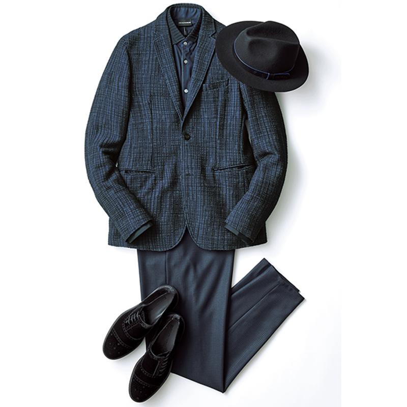 ネイビーウールのジャカード柄ジャケットと共地のジレで作る上半身“おソロ”のレイヤードスタイル。ボトムスにもネイビーパンツを合わせれば、3ピースのような大人の統一感漂う装いに。ジャケット11万5000円、ジレ4万9000円、シャツ3万7000円、パンツ6万円、ストール3万7000円、ベルト2万4000円、靴6万7000円、時計4万7000円、ハット2万6000円/すべてエンポリオ アルマーニ(ジョルジオ アルマーニ ジャパン)