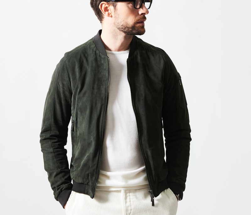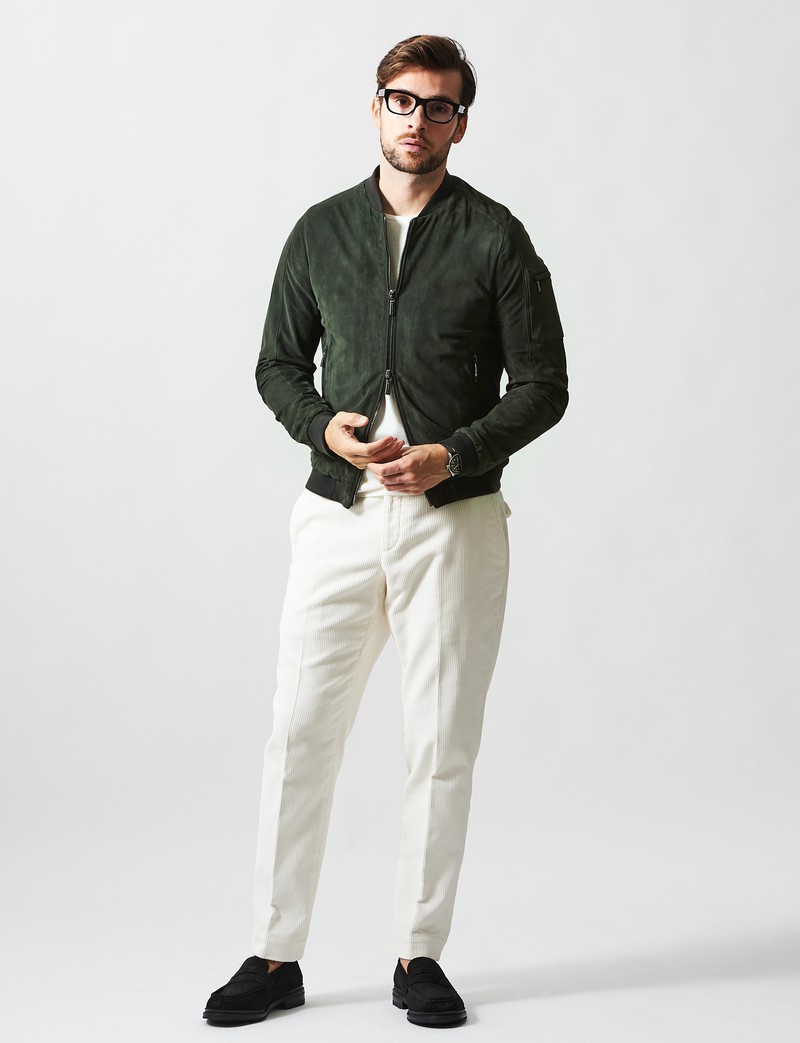 レザーならではの男らしさは保ちつつも、ひと味違う優しさが宿るのが最大のポイント。合わせる他のアイテムを、ホワイトを基調にしたクリーンなものに徹すれば、よりマイルドな印象を抱かせることが可能です。