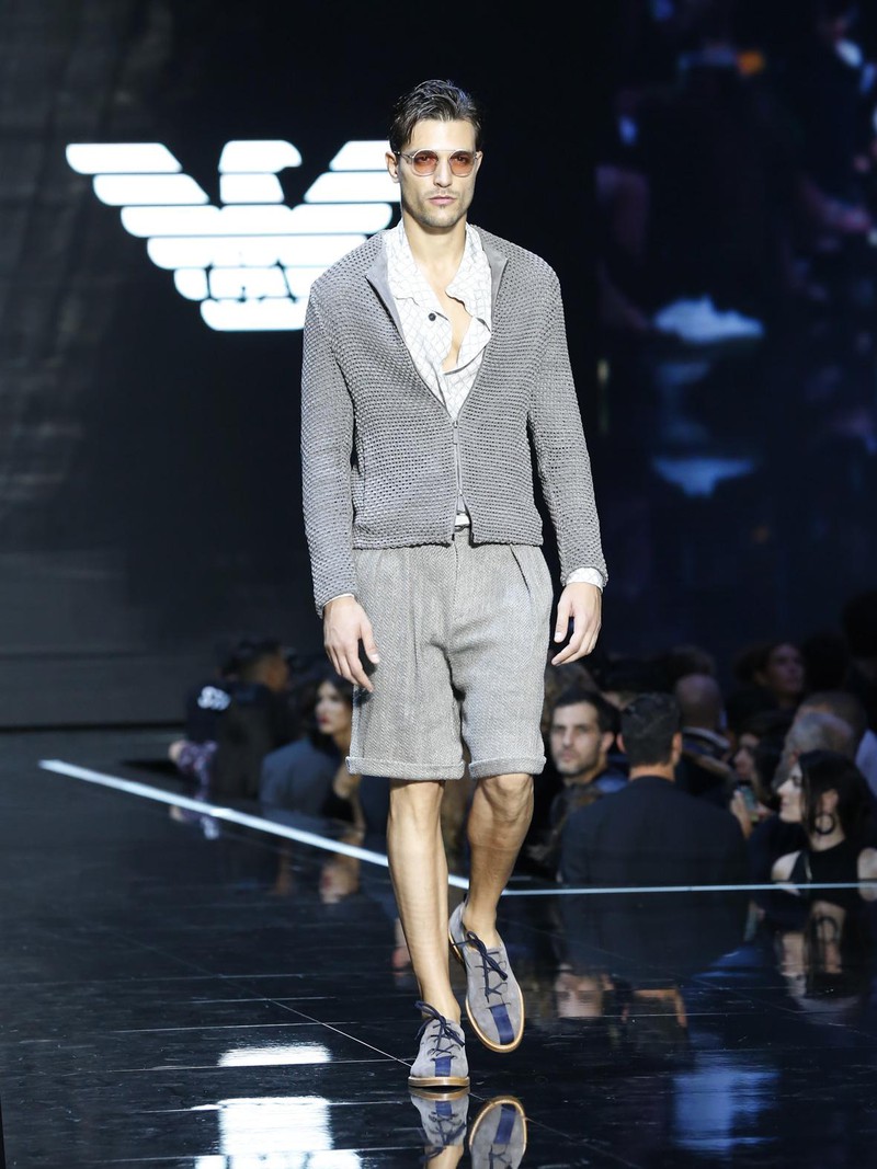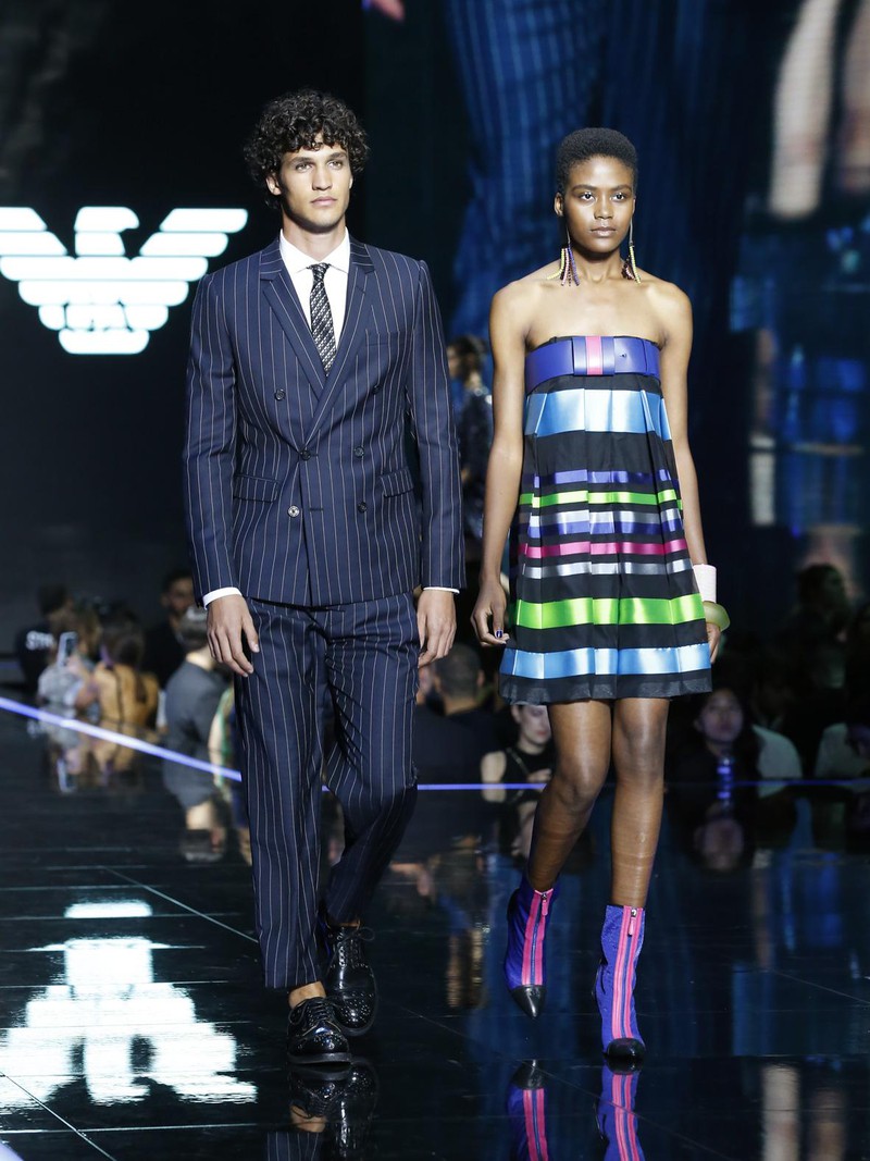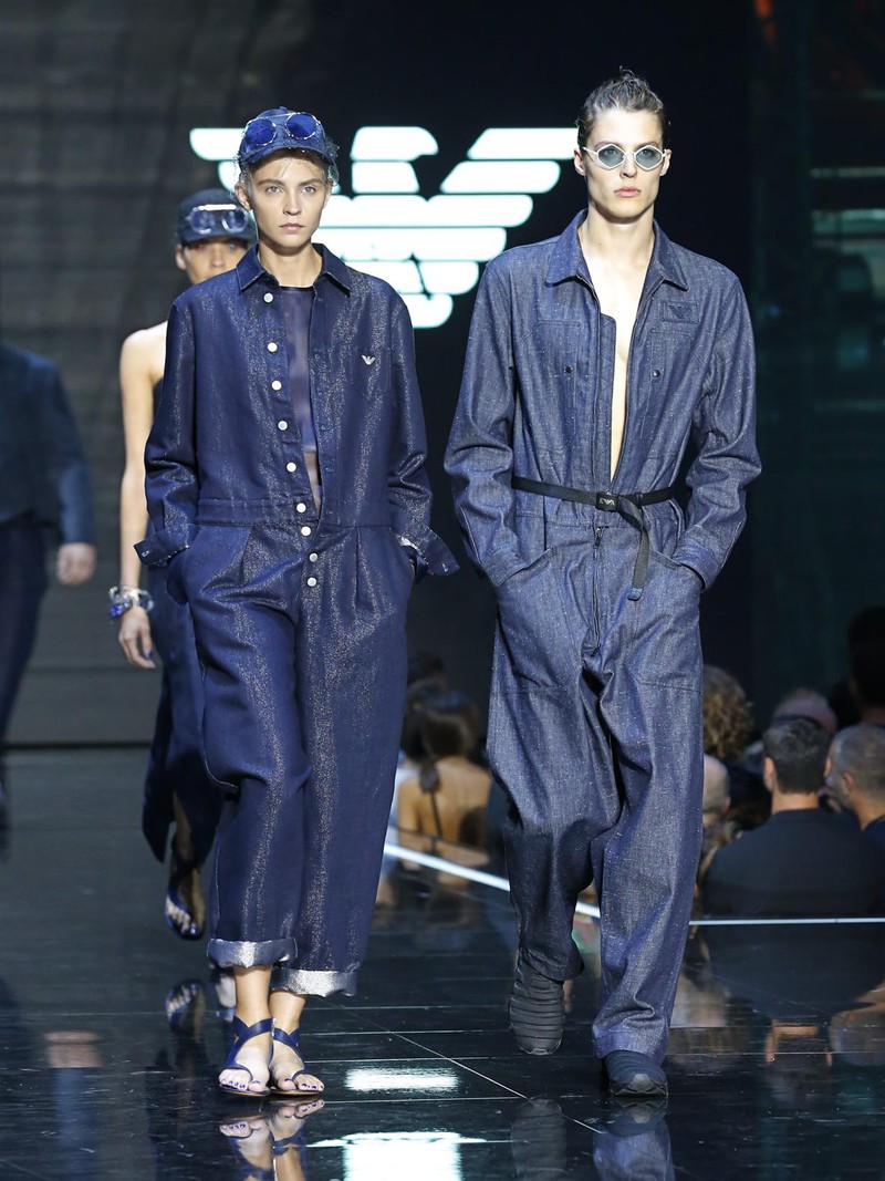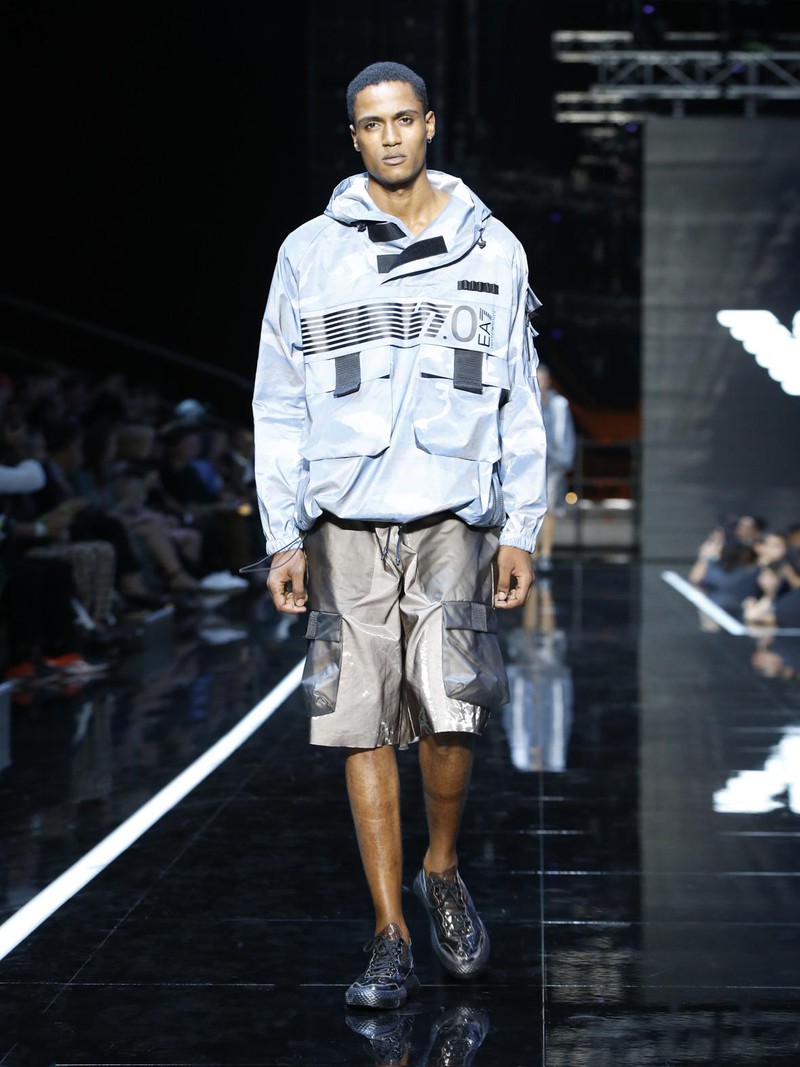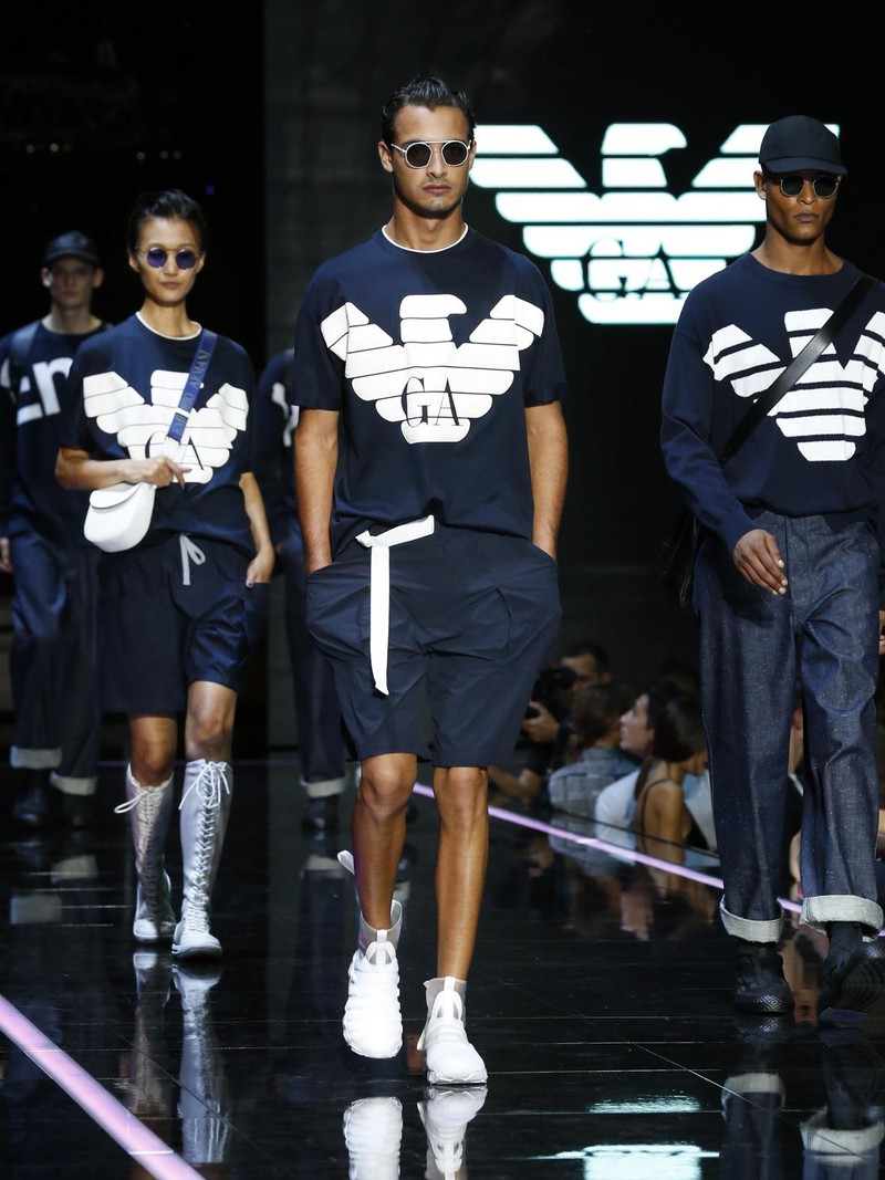 エンポリオ アルマーニにとってミラノ・リナーテ空港は縁のある場所で、ここの格納庫には、1996年から「EMPORIO ARMANI」のロゴとアイコンでもあるイーグルマークが掲げられている。そんなブランドを象徴する空間での、革新的なファッションショーでもあったのです。