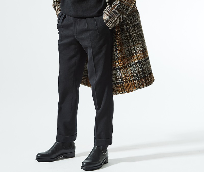 大人の余裕という点ではドレスシューズもアリ。ですが、ミドルカット以上のブーツなら、ソックスが顔を覗かせることがないので、黒一色での統一が順守できます。難易度も下がるので、これは覚えておいて損はありませんよ。