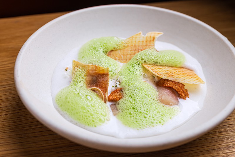 ▲ ふわふわの抹茶フォームにココナッツチップなど、食感も豊かなHamachi Tradito with Uni, coconut, Matcha。