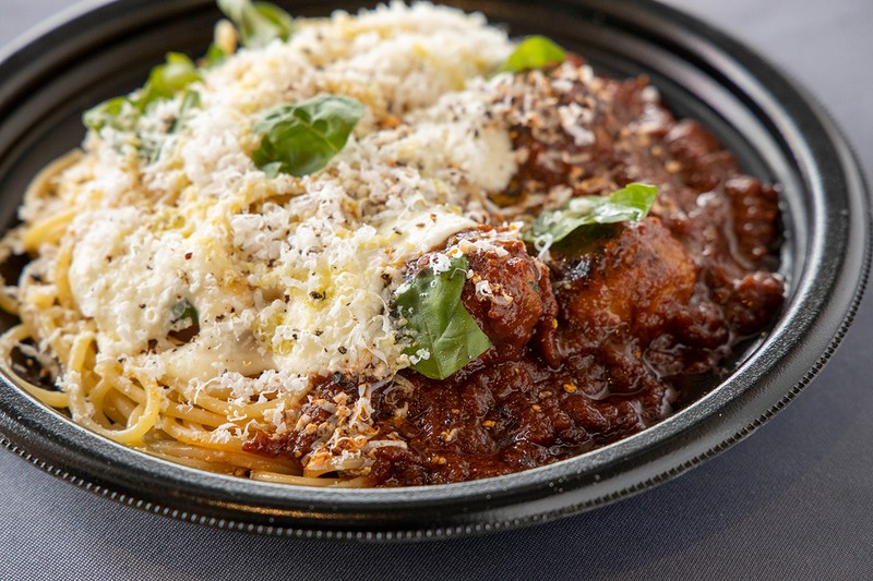 そして、パスタやカレーなどのアラカルトもあります。写真は、そのなかのイチ押し! サカエヤさんが扱うジビーフ熟成牛のミートボールと燻製モッツァレッラのトマトソースです。モチモチ、アルデンテのパスタにこってりミートソースが定番の何度食べても飽きない味。そこへ噛み心地もしっかりと程よい、肉汁溢れるミートボールが載っています。