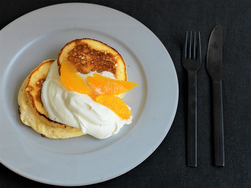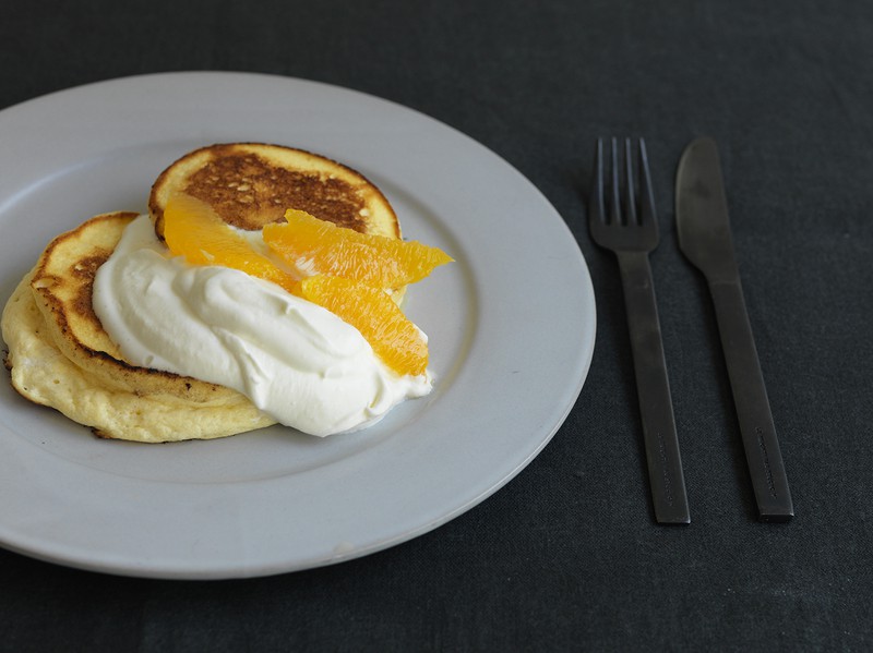 パンケーキはシンプルにバターとシロップで食べてもおいしいですが、今回は初夏らしくオレンジを添えました。濃厚なリコッタパンケーキを柑橘がさっぱりとさせてくれて、何枚でも食べたくなるおいしさです。